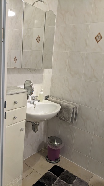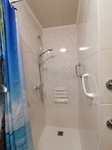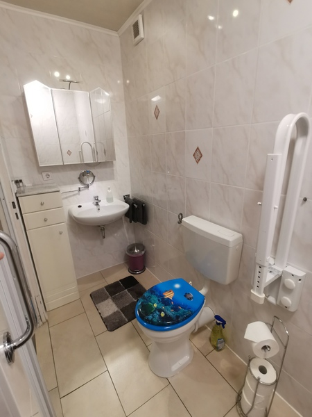 Ebenerdige Dusche mit Duschhocker an der Wand. Aufstehhilfe an der Toillette.
